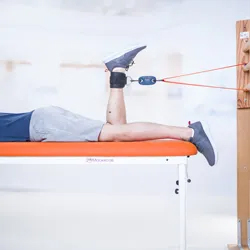 Mesure de la force du quadriceps avec la sangle rigide fixée sur la table du kinésithérapeute. Comptage des répétitions des membres inférieurs : Les ischio-jambiers fonctionnent avec l'élastique fixé sur les espaliers :